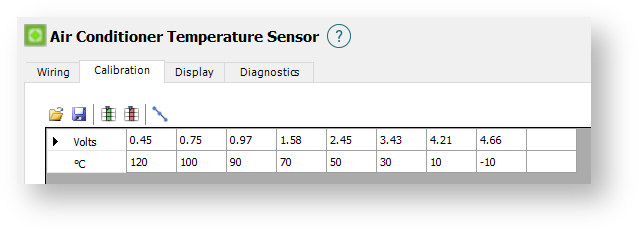 This allows calibrations for a A/C Temperature Sensor to be loaded or saved. A number of calibrations come pre-installed with the ESP Software package. If your sensor is not listed, a custom calibration can be created with the data provided by the sensor manufacturer.