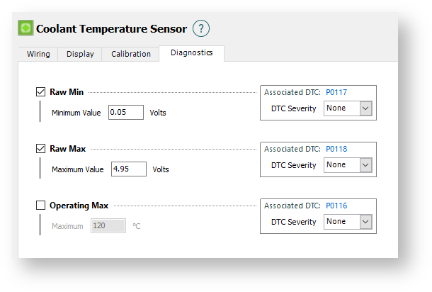 When enabled, this allows for the error code P0117 to be set when the voltage is below the set amount. This is used to detect a short or disconnection with the wiring. If the Engine Protection function is active a DTC Severity level can be selected for this condition if desired. (Default = Disabled)
