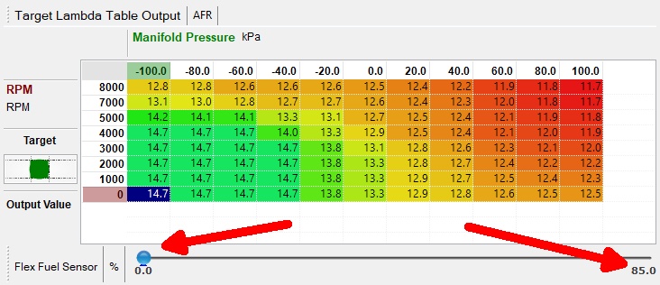 After the relevant tables have all been expanded now you should move the slider to 85 and perform a full tune again to suit E85 fuel. Always be wary of accidently selecting the wrong slider position. To be sure you have the correct table selected you can press the Space Bar while in any table and it will jump to the current cell that is being used by the ECU.
