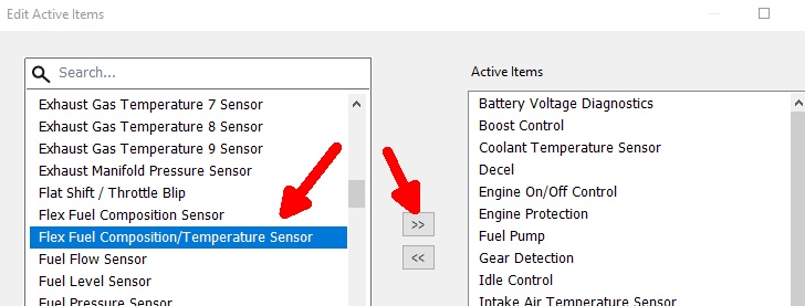 3. If a Flex Fuel Composition/Temperature Sensor is not on the list it should be added by selecting Add/Remove Function and moving the sensor to the right-hand side of the list and then hitting OK.