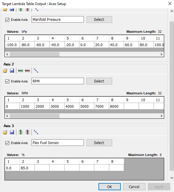 In this example, we are expanding the Target Lambda table from 3D to 4D. This is done by enabling Axis 3, selecting the Flex Fuel Sensor, and adding values for 0 and 85. Then hit OK. Notice we are not adding any additional Ethanol percentages at this point. Only 0 and 85.