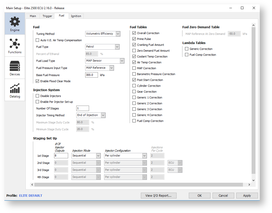 This section contains setup information for fuel configuration, including number of stages, injection mode, tuning method, and table selection.