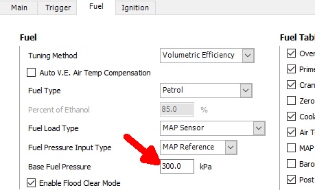 The Base Fuel Pressure is the pressure that the system operates at when the engine is not running. i.e. not under vacuum or boost, and can be found by turning on the fuel pump without the engine running and monitoring the fuel pressure, or it can be tested with the engine running and the vacuum hose disconnected from the Fuel Pressure Regulator. This can be entered into the "Main Setup / Engine / Fuel" section shown below. This setting has no impact on the tuning of the engine, it is only used as a reference point for Engine Protection.