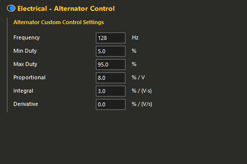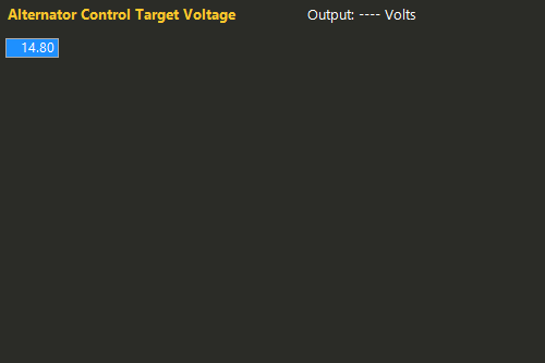 TargetThe Target Voltage that you wish to have the Alternator Control aim for. Typically this will be 13.8 to 14.4V. Too low will not charge the battery, and too high can cause battery damage.