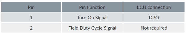 To command a specific output charging voltage, the ECU must send a +5V PWM signal to the  "Turn On Signal” pin on the alternator (Pin 1). The normal operating duty cycle range is 5–95 percent at a frequency of 128 Hz. However, the alternator will self-excite and fail-safe to 13.8V when not controlled. The "Field Duty Cycle Signal" pin is used by the alternator to provide a feedback signal of the output charging voltage to the factory ECU and Body Control Module (BCM) and does not need to be connected to the Haltech ECU.