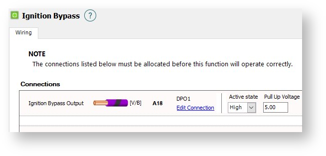 DPO-1 should be selected for this function due to it having a programmable Pull Up voltage. The Pull Up should be set to 5.00, and the Active State set to High for the Ignition Bypass to function correctly.