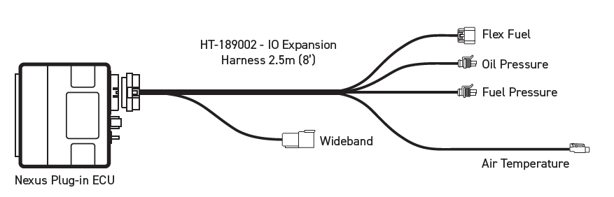 In addition to the basic expansion harness included, Haltech offers an optional I/O expansion harness (sold separately) to conveniently support common sensor upgrades for your Nexus Plug-in ECU. This expansion harness is terminated with connectors for sensors such as a Haltech wideband hardware pack, flex fuel composition sensor, oil pressure sensor, fuel pressure sensor, and air temperature sensor. It also includes spare pins for connecting additional outputs available on the 26-pin connector.