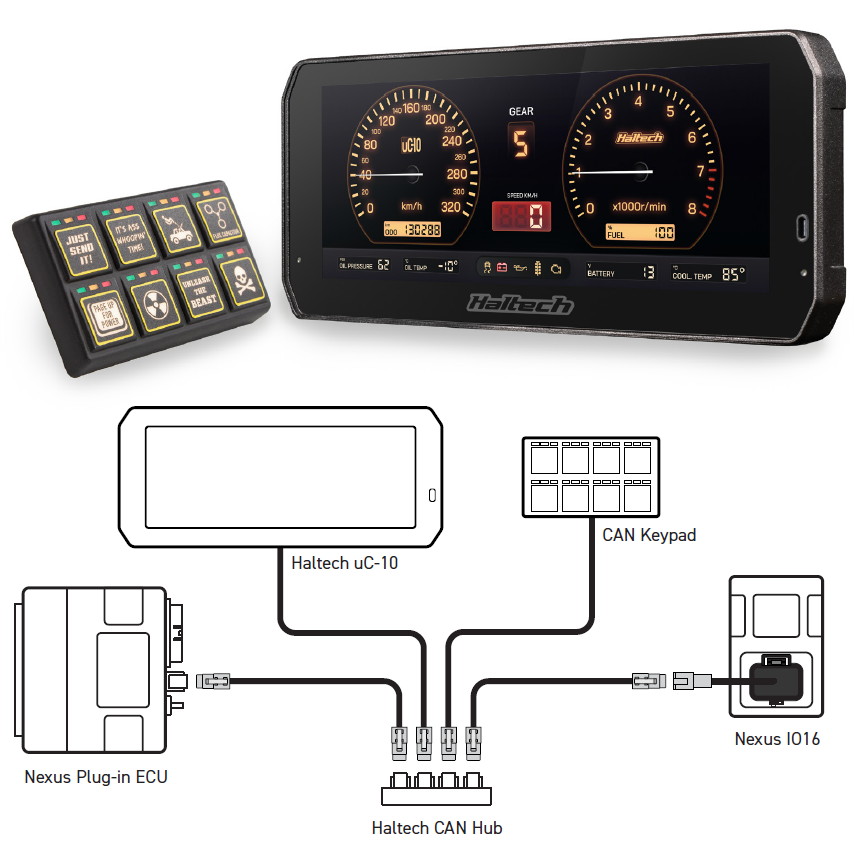Multiple CAN devices can be used simultaneously by linking them together using Haltech CAN cables and a Haltech CAN hub. Examples of Haltech CAN devices include the Haltech uC-10 display dash and the Haltech CAN keypad. The dash allows user-selected ECU or engine parameters to be displayed on a customizable screen, while the keypad enables you to scroll through multiple screens or control other functions managed by the ECU.