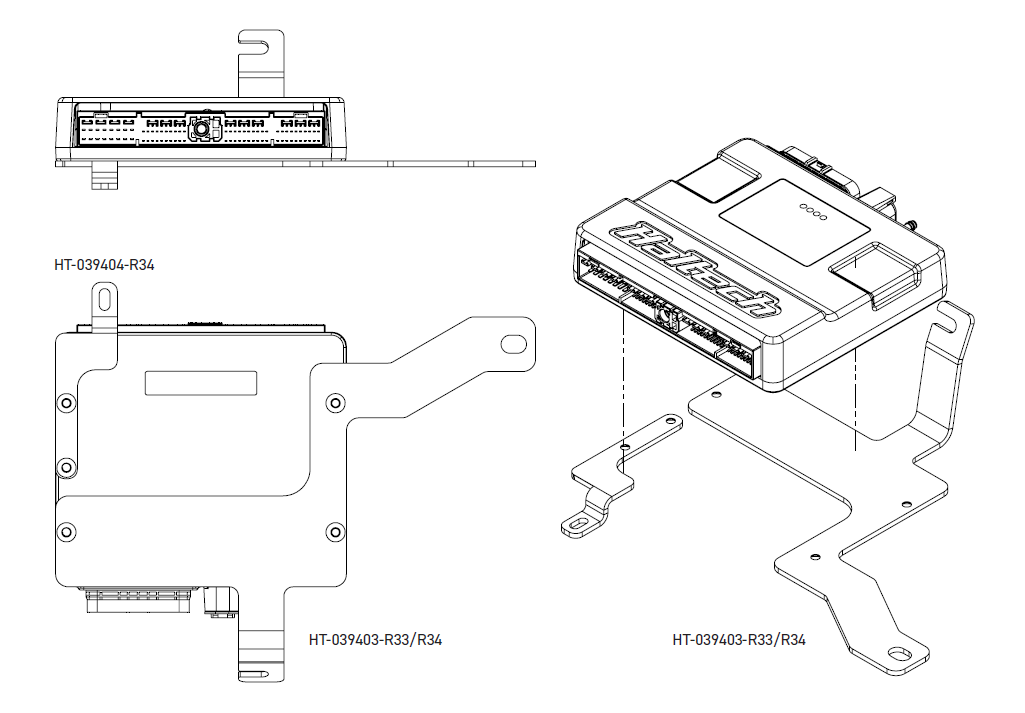The Nexus Plug-in ECU is also supplied with mounting brackets and screws to facilitate installation in this location. Each vehicle application (e.g., R32, R33, and R34) requires two brackets. The correct bracket combinations are shown below and on the following pages to ensure proper installation.