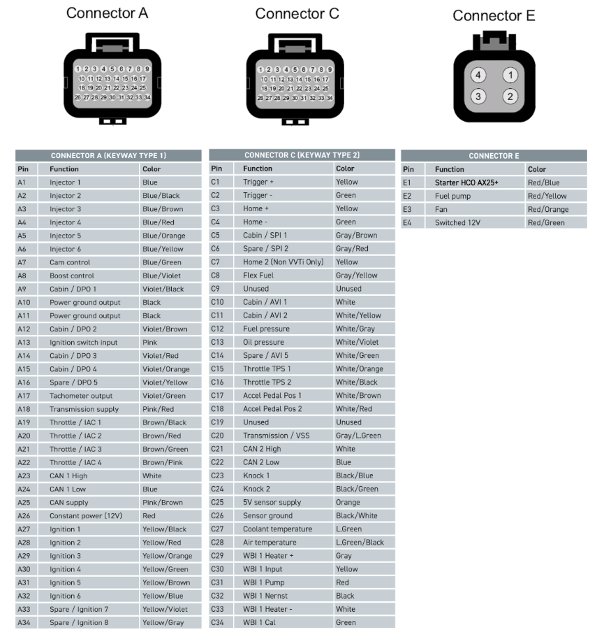ECU connectors (Plugs A, C, and E)