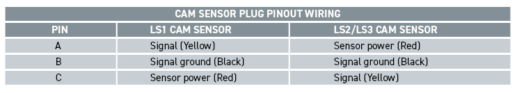 Refer to the table below for the pinout. Insert the pins into the connector until they lock into place. Before connecting to the cam sensor, install the wire retainer at the back of the connector.