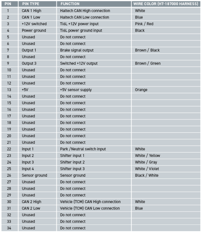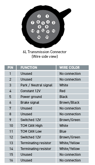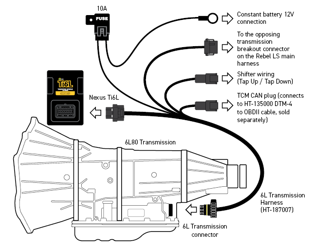 NOTE: It is important to remember that this application only supports 6L transmissions that expect shifter tap up and tap down signals to be wired external to the transmission, with the shift request signals transmitted over CAN. If your transmission’s shifter tap up and tap down signals are wired directly to the transmission via the 16-pin connector, you will need to wire them in the same way.