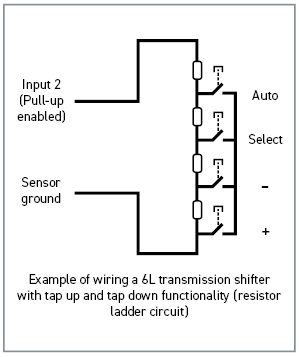 Most of these 6L shifters incorporate a resistor ladder circuit, where the tap up, tap down, and other switch circuits are all integrated into a single circuit. Each function provides a different resistance (ohms) reading, which the Ti6L detects and differentiates. Some aftermarket 6L shifters may instead use discrete switch circuits for each function, or a combination of discrete circuits and the resistor ladder setup.