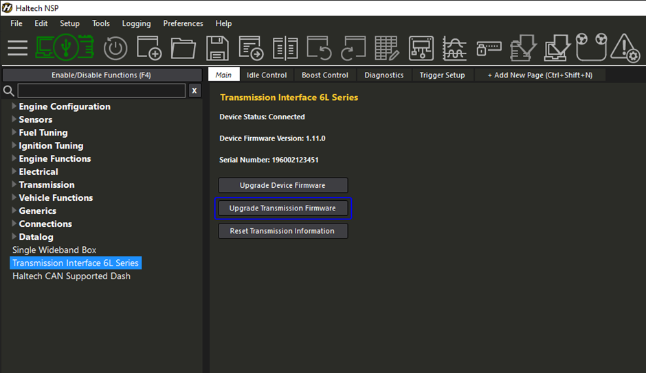 3. Turn the ignition key to the ON position, connect to the Nexus ECU using NSP, then navigate to the “Transmission Interface 6L Series” page within the software navigation tree.