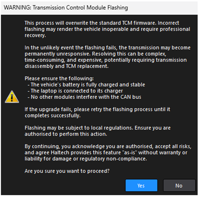 4. Click “Upgrade Transmission Firmware”, read the reflashing notes and warning, then click “Yes” to proceed.