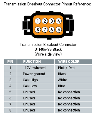 If you are using this 6L transmission harness with a universal Nexus ECU/VCU that has been custom wired using a universal harness, the 8 pin DTM transmission breakout connector must be wired to the Haltech CAN system, which provides switched 12V power, power ground, and the CAN High and CAN Low wires required for CAN communication. Refer to the pinout table below for the DTM06-8S transmission breakout connector pinout reference on the transmission harness to be able to wire it in.