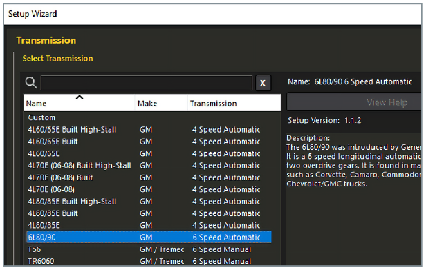If you are manually setting up the Nexus Ti6L Transmission Interface - such as when modifying an existing ECU map or using the Nexus Ti6L with a universal Nexus ECU/VCU - the first step is to navigate to the Transmission section in the Navigation Tree on the left side of the NSP software and click “Select Transmission.” This will open a window displaying a list of GM transmissions. Select “6L80/90” and click OK.