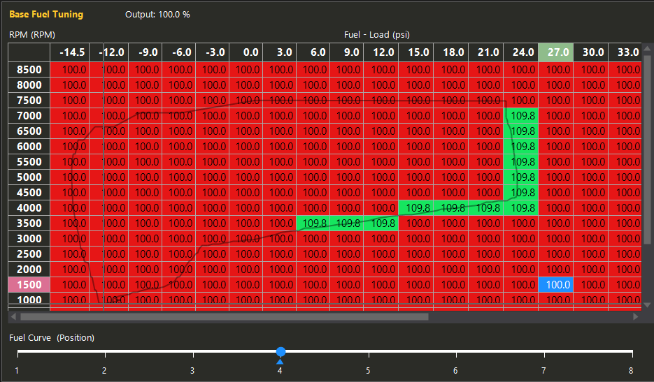 If the Base Fuel Tuning table has its slice axis enabled (4D) and a particular row and column were only visited on a different slice, then the red or blue colour will be drawn much darker to indicate this.