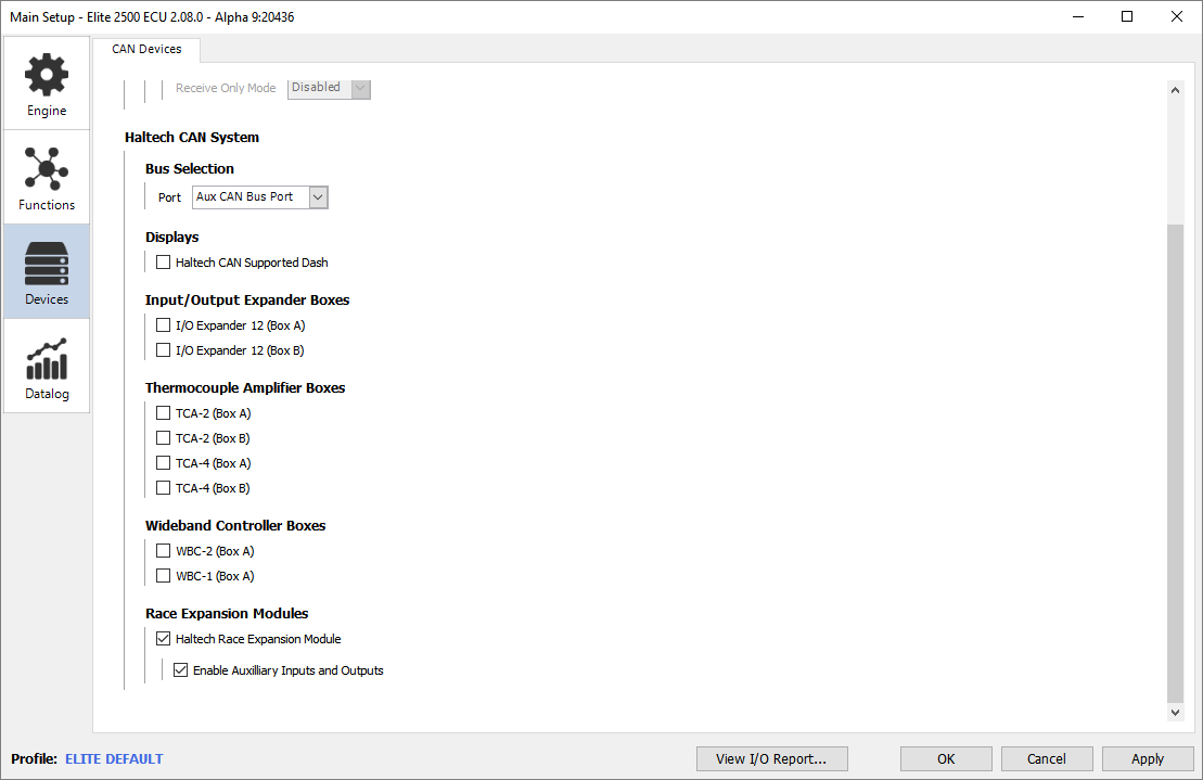 Connect the REM to the Elite 2500 via CAN then go online with the Elite 2500. All USB communication is performed through the Elite 2500 ECU. Enable the "Race Expansion Module" under Main Setup > Devices > Race Expansion Module. You can also Enable the "Auxiliary Inputs and Outputs" available on the REM unit in this menu. Please note you may use either the REM Auxillary Inputs and Outputs OR Haltech I/O Expander 12 boxes but not both at the same time.