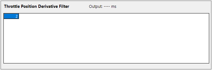 This table sets the derivative filter for the Throttle Position value.TPS-Derivative is used as a rate of change channel for the TPS. Too high can dull response, too low can give unstable readings and false trip the Transient Throttle function.