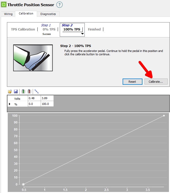 5. Open the throttle as far as it can open and press the Calibrate button again to record the voltage for 100% TPS.
