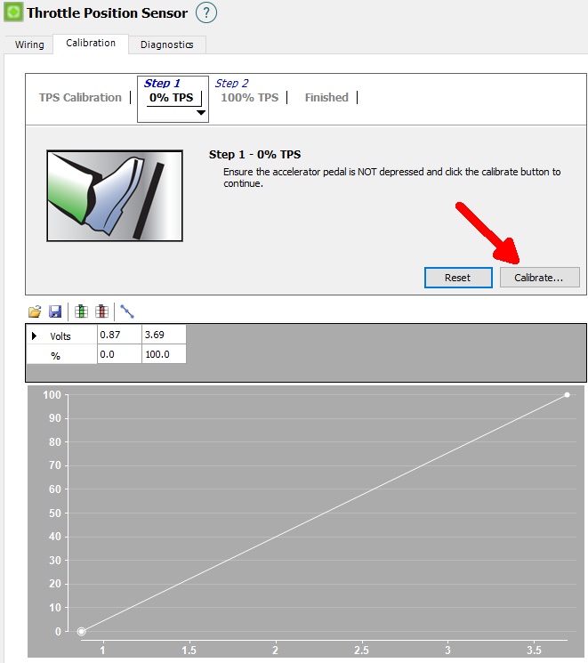 4. Ensure that the throttle is completely closed and press the Calibration button to record the voltage for 0% TPS.