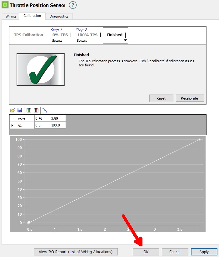 6. You can note the voltages recorded for 0% and 100% TPS and if they look reasonable you can press OK and you have completed the calibration.