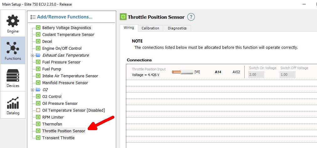 1. Go to the Main Setup / Functions / Throttle Position Sensor section.