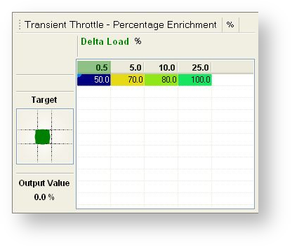 The Percentage Enrichment table determines what fraction of that amount of enrichment is required when you move the throttle more slowly, or only make small changes in throttle. The slower throttle changes or smaller throttle changes, results in a smaller Delta Load.